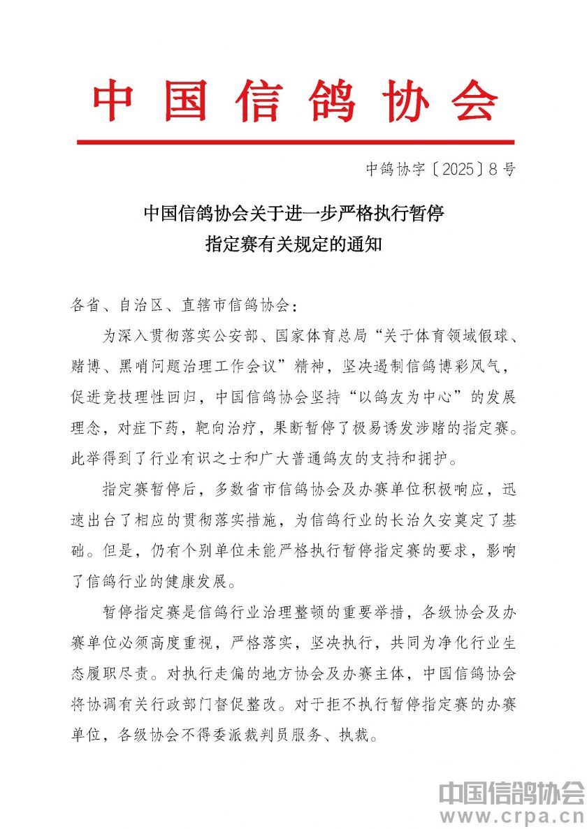 中国信鸽协会关于进一步严格执行暂停指定赛有关规定的通知