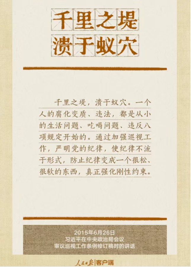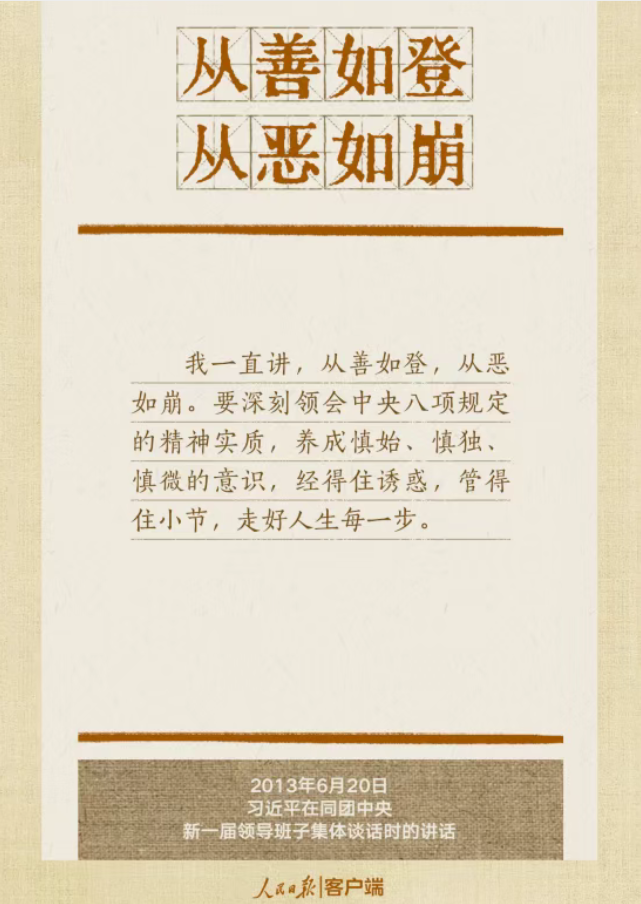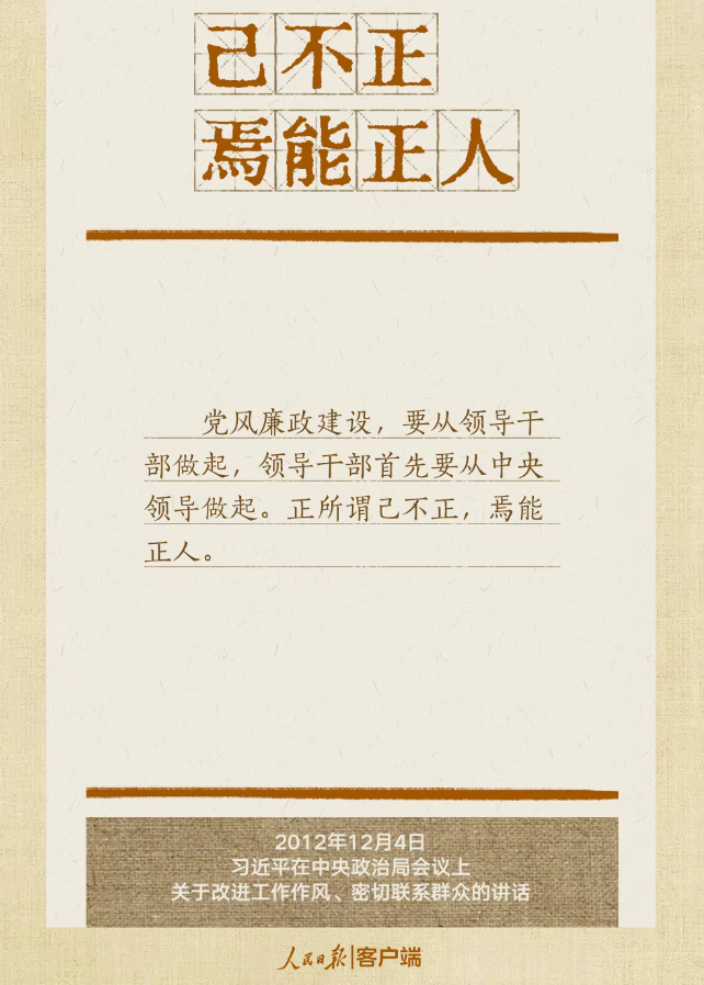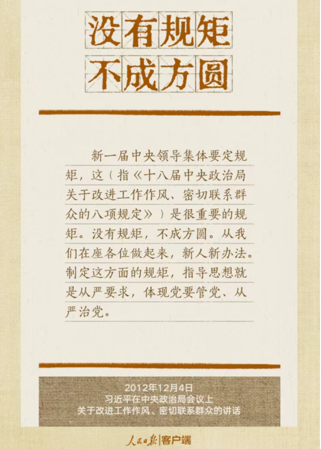 党的十八大以来,习近平总书记多次就抓好党的作风建设、贯彻落实中央八项规定精神发表重要讲话,作出重要批示,提出明确要求。“没有规矩,不成方圆”、“己不正,焉能正人”、“尽小者大,慎微者著”……总书记引用的这些古语耐人寻味。